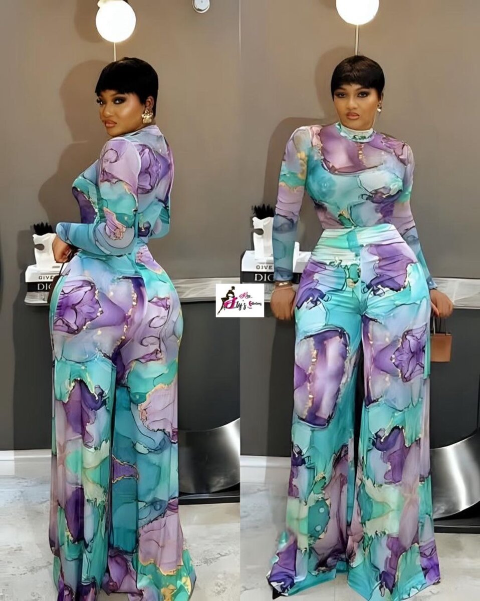 Optez pour cette combinaison élégante et colorée, parfaite pour toutes occasions spéciales. Avec son imprimé vibrant et ses manches longues, elle allie style et confort. Idéale pour une soirée ou un événement chic.