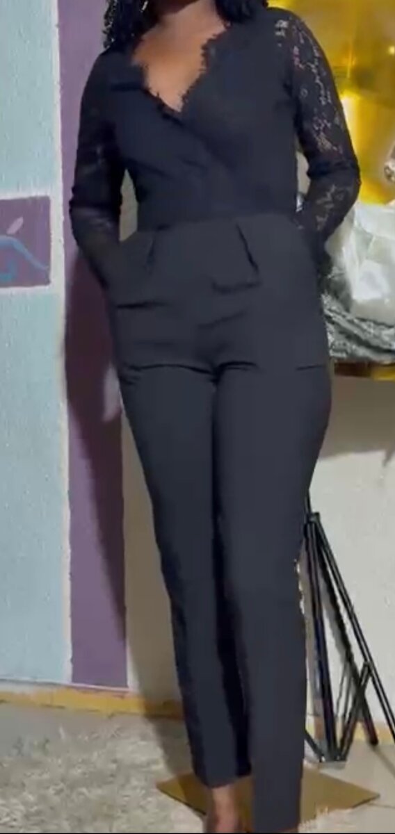 Cette combinaison noire est la quintessence du chic avec ses manches en dentelle délicate et sa coupe ajustée. Parfaite pour une soirée élégante ou une sortie spéciale, elle sublime votre silhouette tout en offrant un confort optimal. Associez-la à des talons pour un look sophistiqué. Idéale pour les événements formels ou cocktails.
