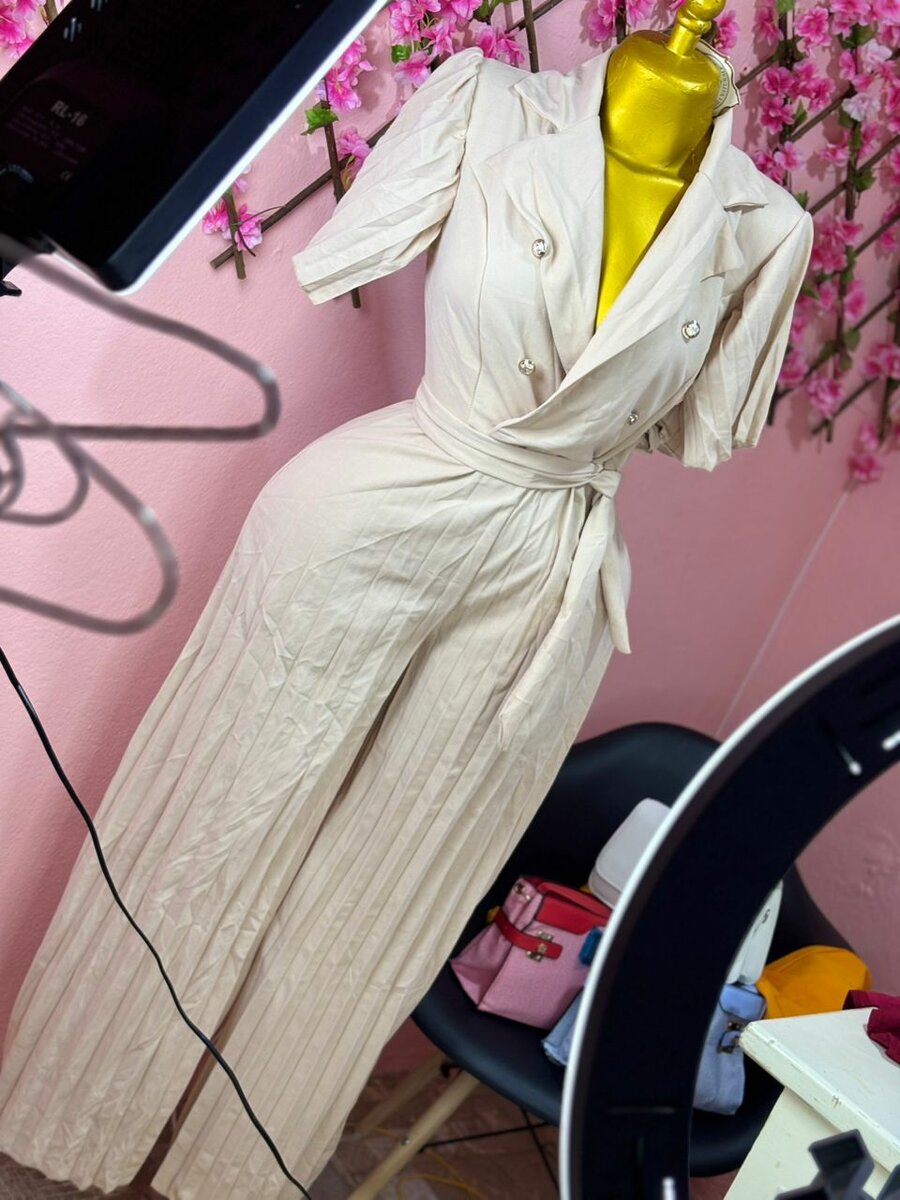 Élégante combinaison beige pour femme avec ceinture intégrée. Conçue pour offrir style et confort, parfaite pour les occasions spéciales ou les sorties en ville. Tissu léger et design moderne garantissant aisance et sophistication.