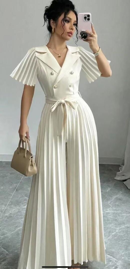 Cette combinaison plissée est idéale pour une allure chic et sophistiquée. Parfaite pour des occasions spéciales, elle allie confort et style avec son design double boutonnage et sa ceinture ajustable. Faites sensation à chaque événement.