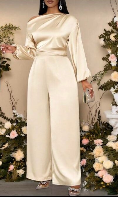 Découvrez cette combinaison élégante en satin. Parfaite pour des occasions spéciales, elle allie confort et style avec une coupe moderne et un tissu de haute qualité. Idéale pour un look sophistiqué.