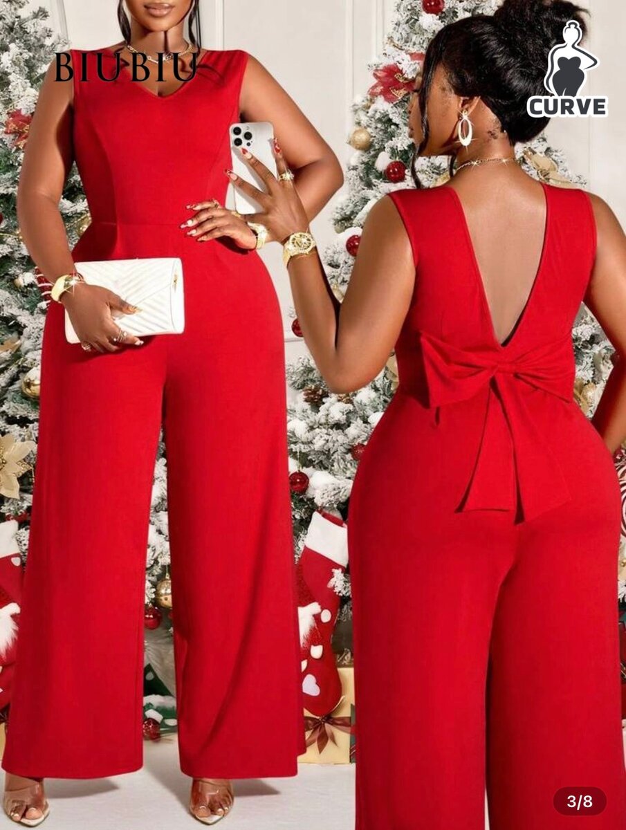 Élégante combinaison pour femme avec col en V et dos nu à nœud. Parfaite pour les soirées et événements spéciaux. Disponible en rouge et bleu pour un look saisissant et chic.
