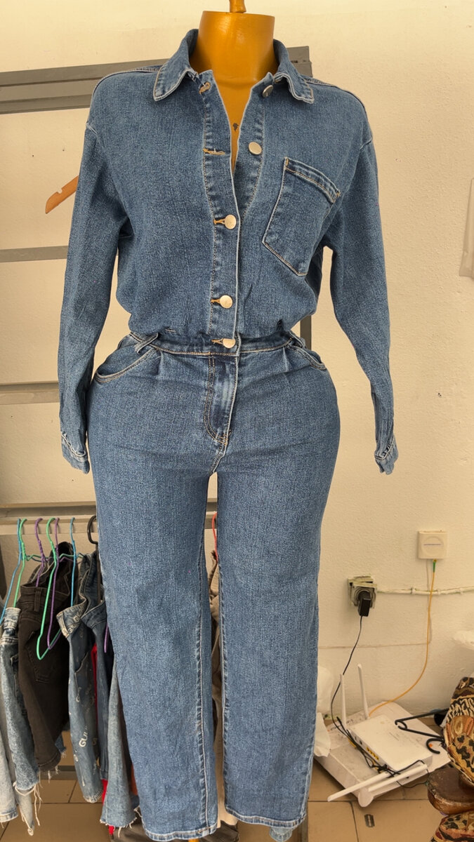 Combinaison en jean pour femme, parfaite pour un look décontracté et élégant. Conçue pour mettre en valeur votre silhouette, cette combinaison est idéale pour les sorties en ville ou les journées décontractées.
