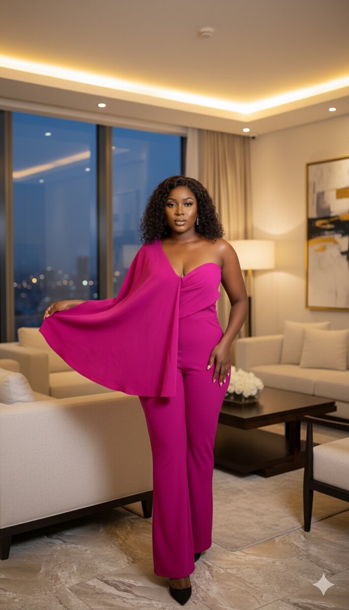 Éblouissez avec cette combinaison rose fuchsia à épaule nue. Idéale pour une soirée chic ou un événement spécial, elle souligne votre silhouette avec élégance. Tissu doux, coupe moderne et confort assuré. Parfaite pour se démarquer avec style.