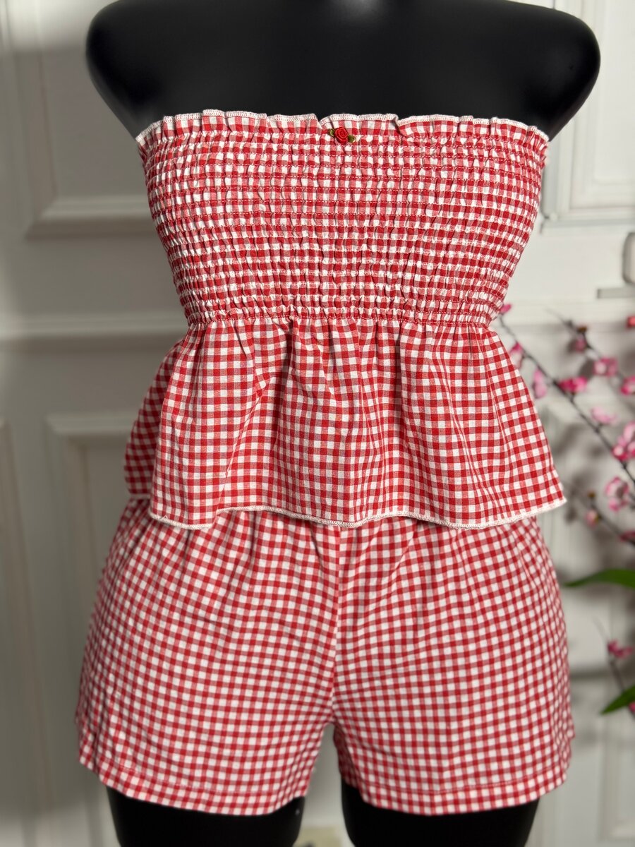 Élégant et confortable, ce combishort à carreaux rouge est parfait pour les journées d'été. Conçu en tissu léger et respirant, il met en valeur votre silhouette avec sa coupe ajustée et son design sans bretelles. Idéal pour les sorties décontractées ou les pique-niques, il vous assure un look tendance et original.