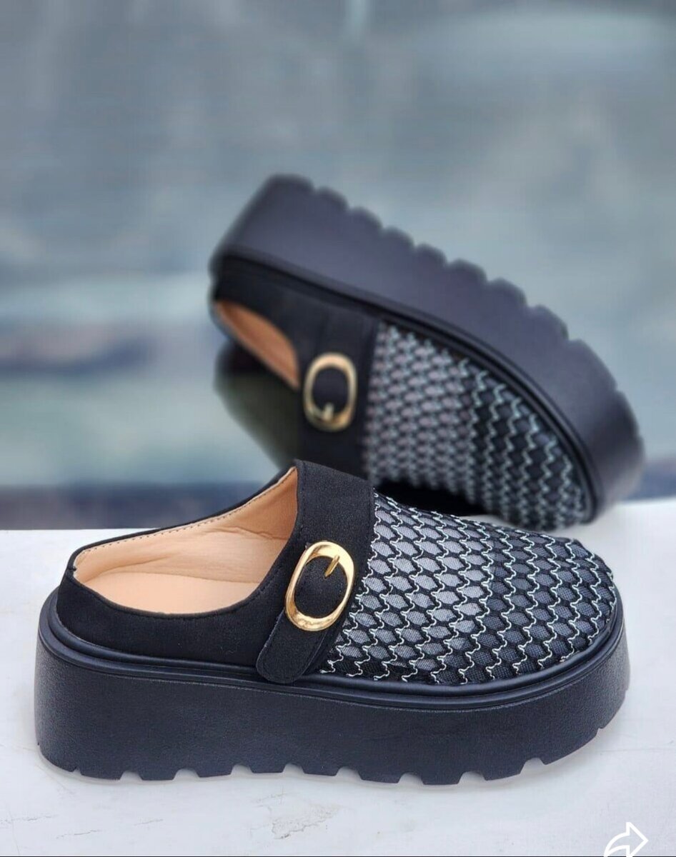 Élégantes mules compensées en cuir noir tressé, parfaites pour un look moderne et sophistiqué. Semelle épaisse pour un confort optimal. Idéales pour les sorties et le quotidien.
