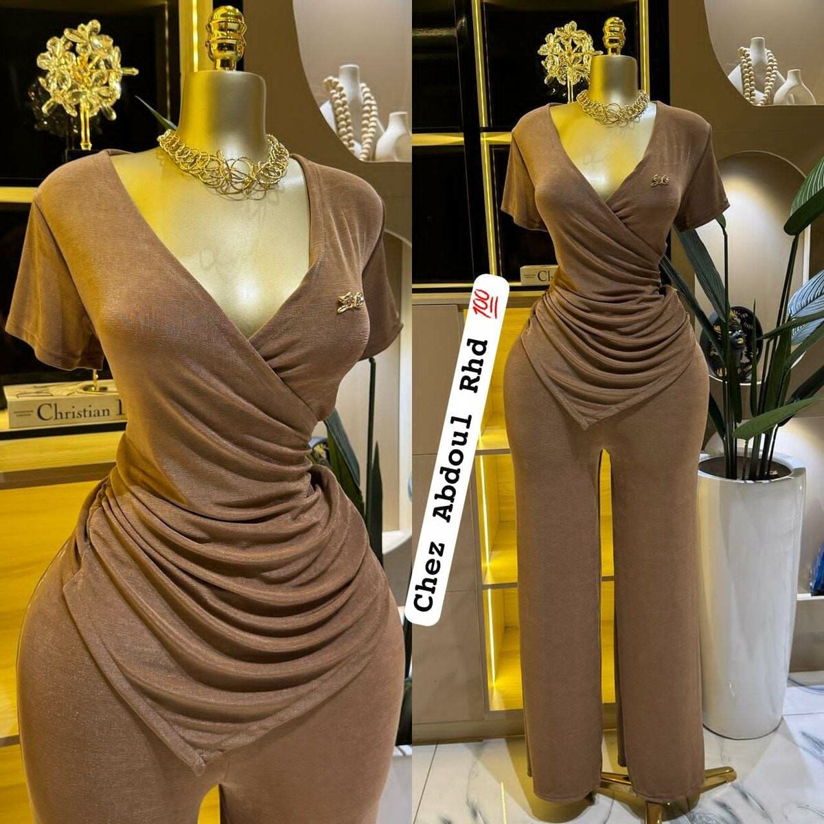 Découvrez cette combinaison élégante pour femme, parfaite pour une soirée ou un événement spécial. Fabriquée avec un tissu doux et extensible, elle offre un confort supérieur et une coupe flatteuse. Le design drapé met en valeur la silhouette, tandis que le décolleté en V ajoute une touche de sophistication. Idéale pour se démarquer avec style.