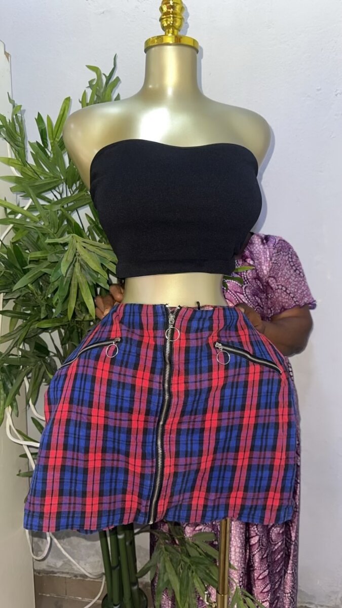 Adoptez un look audacieux avec ce complet jupe à carreaux rouges et bleus. Parfaite pour un style décontracté et tendance, elle se ferme par une fermeture éclair centrale et dispose de poches pratiques.