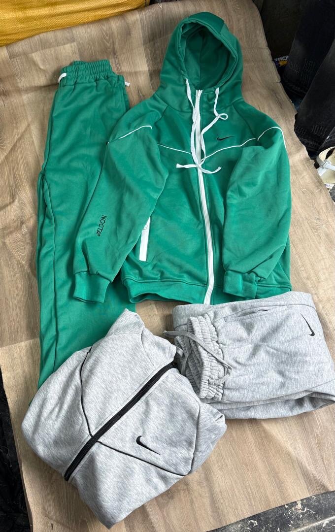 Confort et style avec cet ensemble de survêtements Nike. Composé d'un haut à capuche vert et d'un bas assorti, ainsi qu'une option grise. Parfait pour le sport ou les sorties décontractées. Conçu pour un confort optimal toute la journée.