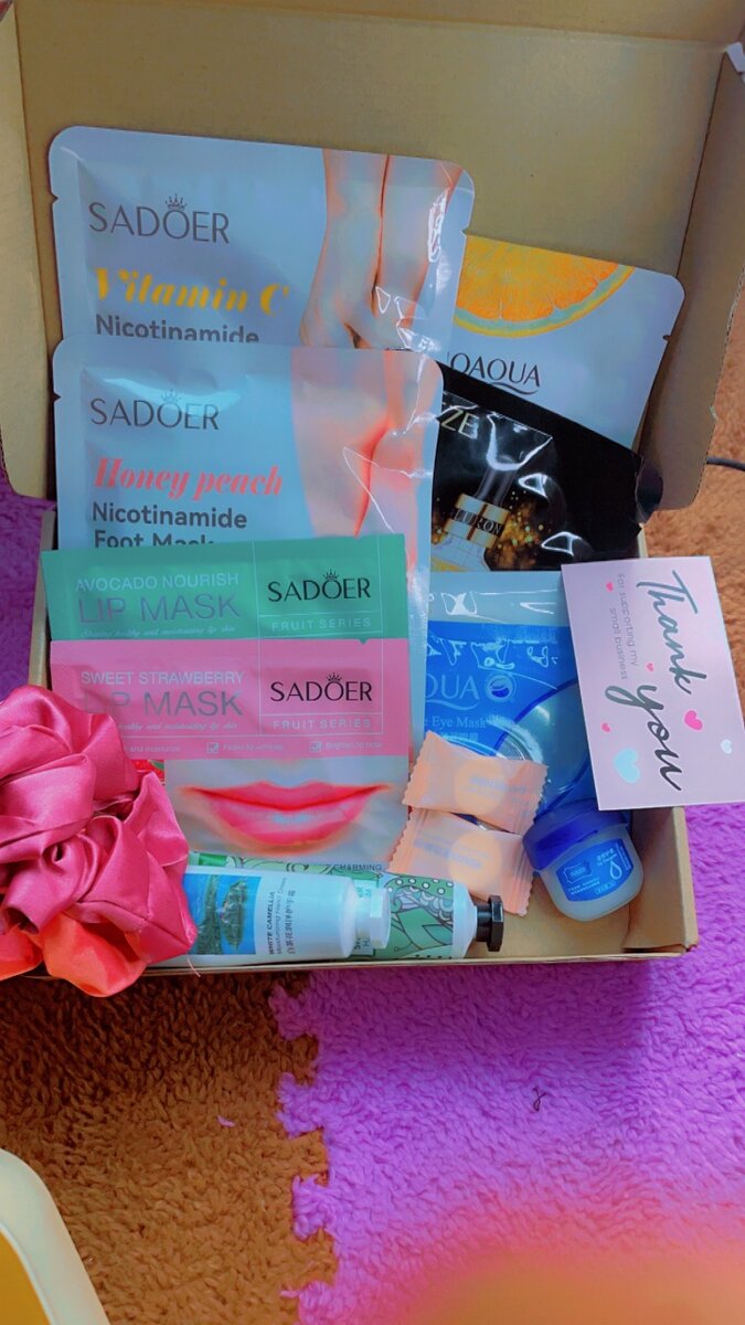 Contains: 2 face masks 2 lip masks 2 under eye masks 2 hand cream 2 scrunchies 2 compressed towels 1 hand mask 1 leg mask 1 lip balm