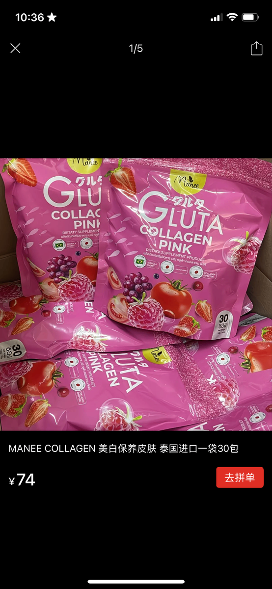 Manee Gluta Collagen Pink est une poudre fabriquée en Thaïlande et qui favorise une peau, des cheveux et des ongles sains. Il contient du collagène, du glutathion, de la vitamine C et des poudres de fruits. Il existe en paquet de 30 sachets.