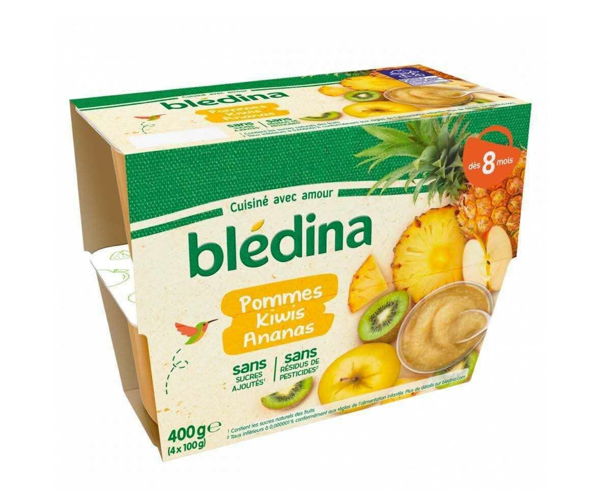 Découvrez la compote BLEDINA pour bébés dès 8 mois, sans sucres ajoutés, avec pommes, kiwis et ananas. Parfait pour des moments de gourmandise saine !