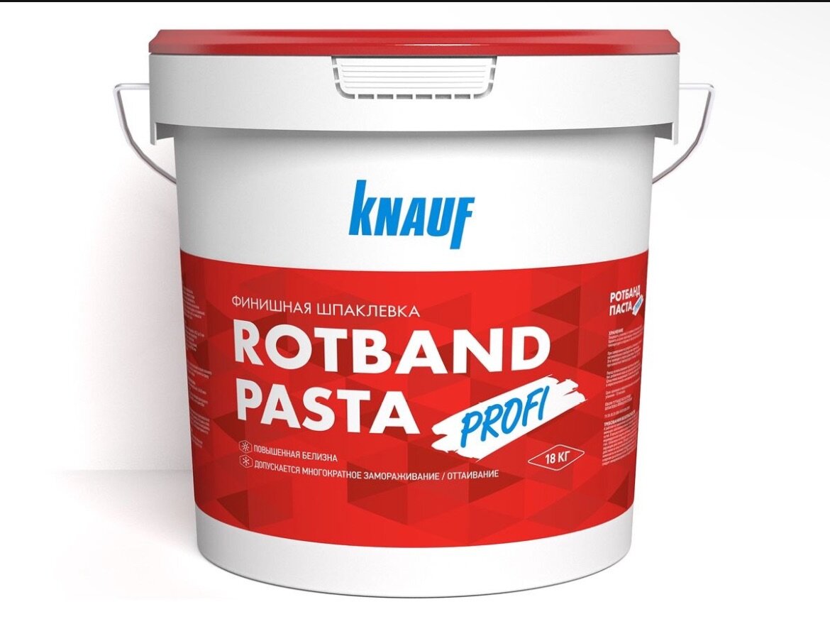 Ротбанд Паста готовая финишная шпаклевка на полимерной основе. Легко наносится, шлифуется и создает гладкую поверхность. Подходит для гипсокартона, бетона, штукатурки. Для внутренних работ. Фасовка: 5 кг, 18 кг. Производитель: Knauf.