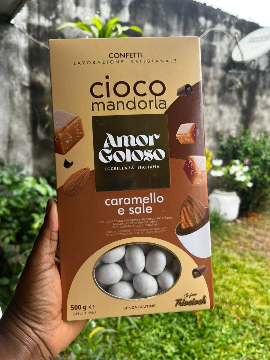Découvrez les confetti 'Amor Goloso' au caramel et sel, une combinaison exquise de chocolat artisanal et d'amandes, idéale pour les gourmands. Sans gluten.