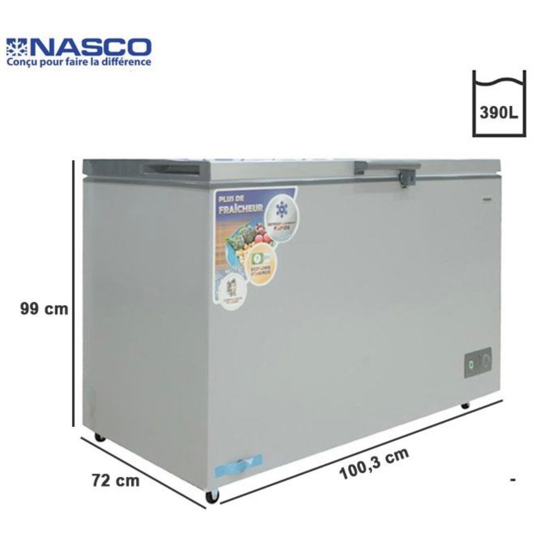 Congélateur coffre NASCO 390L - Stockez et conservez vos aliments au frais. Design robuste et spacieux, parfait pour une utilisation domestique ou professionnelle. Économique et fiable.