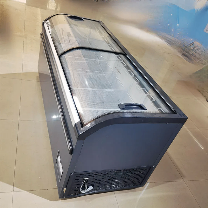 Un congélateur moderne avec un couvercle en verre pour une visibilité optimale des produits. Idéal pour les commerces de détail, supermarchés et restaurants. Maintient les produits à une température stable pour une conservation prolongée.