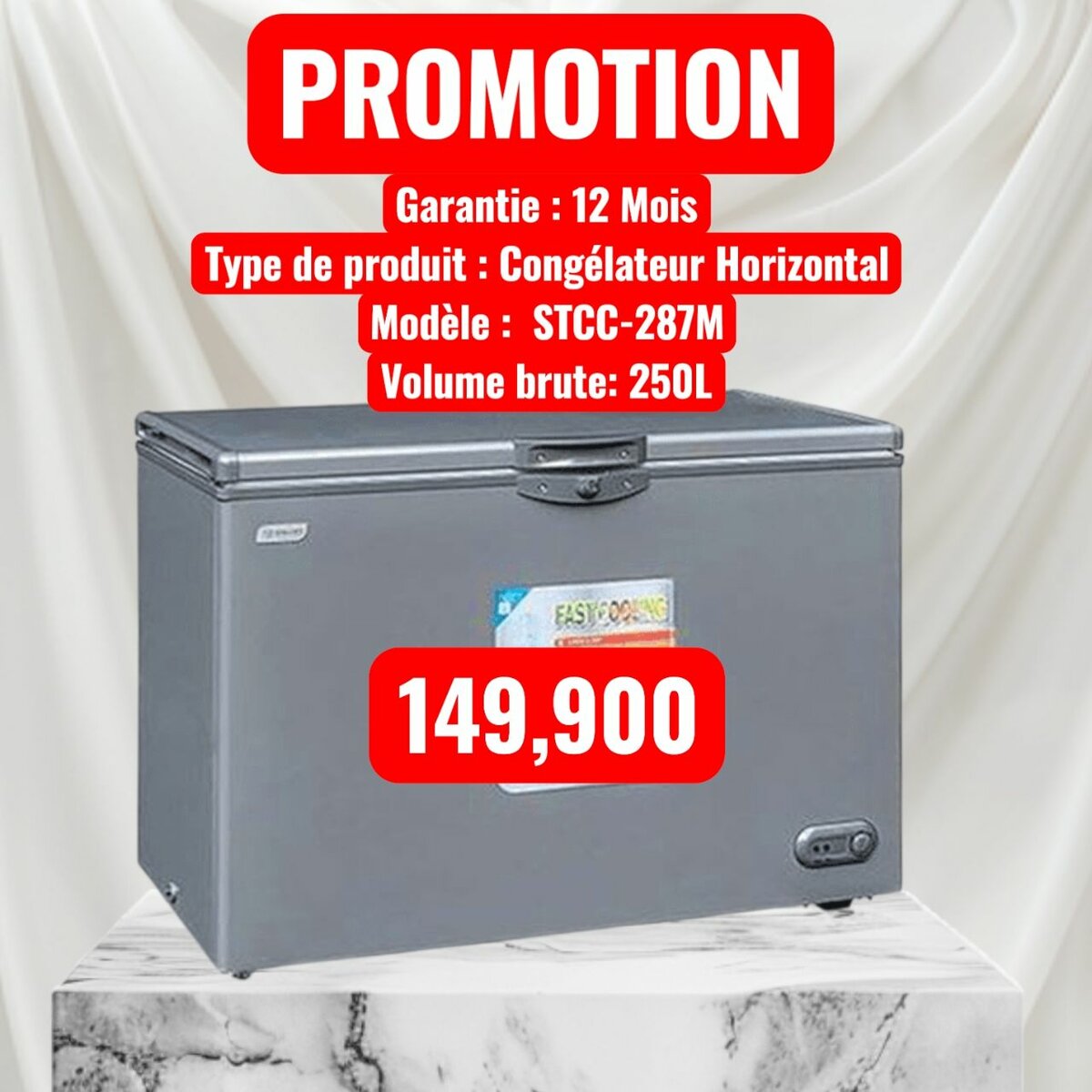 Optez pour ce congélateur horizontal 250L, idéal pour conserver vos aliments en toute sécurité. Avec une garantie de 12 mois, ce modèle STCC-287M allie efficacité et grande capacité. Parfait pour la maison ou le commerce.