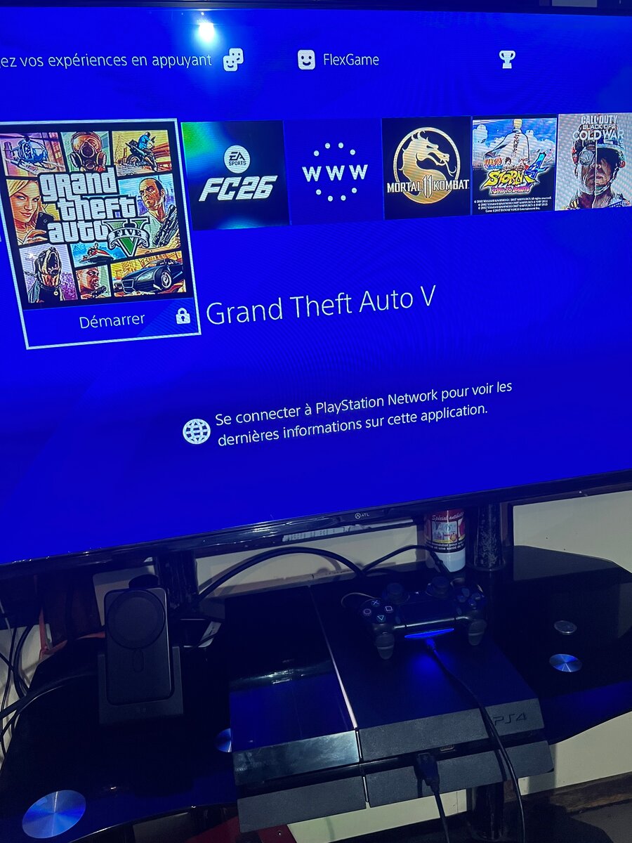 Profitez d'une expérience de jeu immersive avec la PlayStation 4 FAT doccasion. Compacte et puissante. La console est vendue avec une manette Des jeux déjà installés tel que GTA 5, FC26 etc..