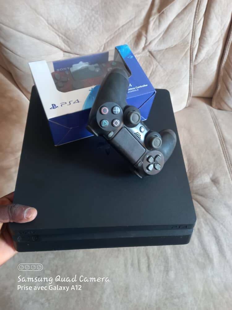 Console PlayStation 4 slim 1To noire avec manette. Livrée avec sa boîte d'origine. État impeccable pour des heures de jeu.