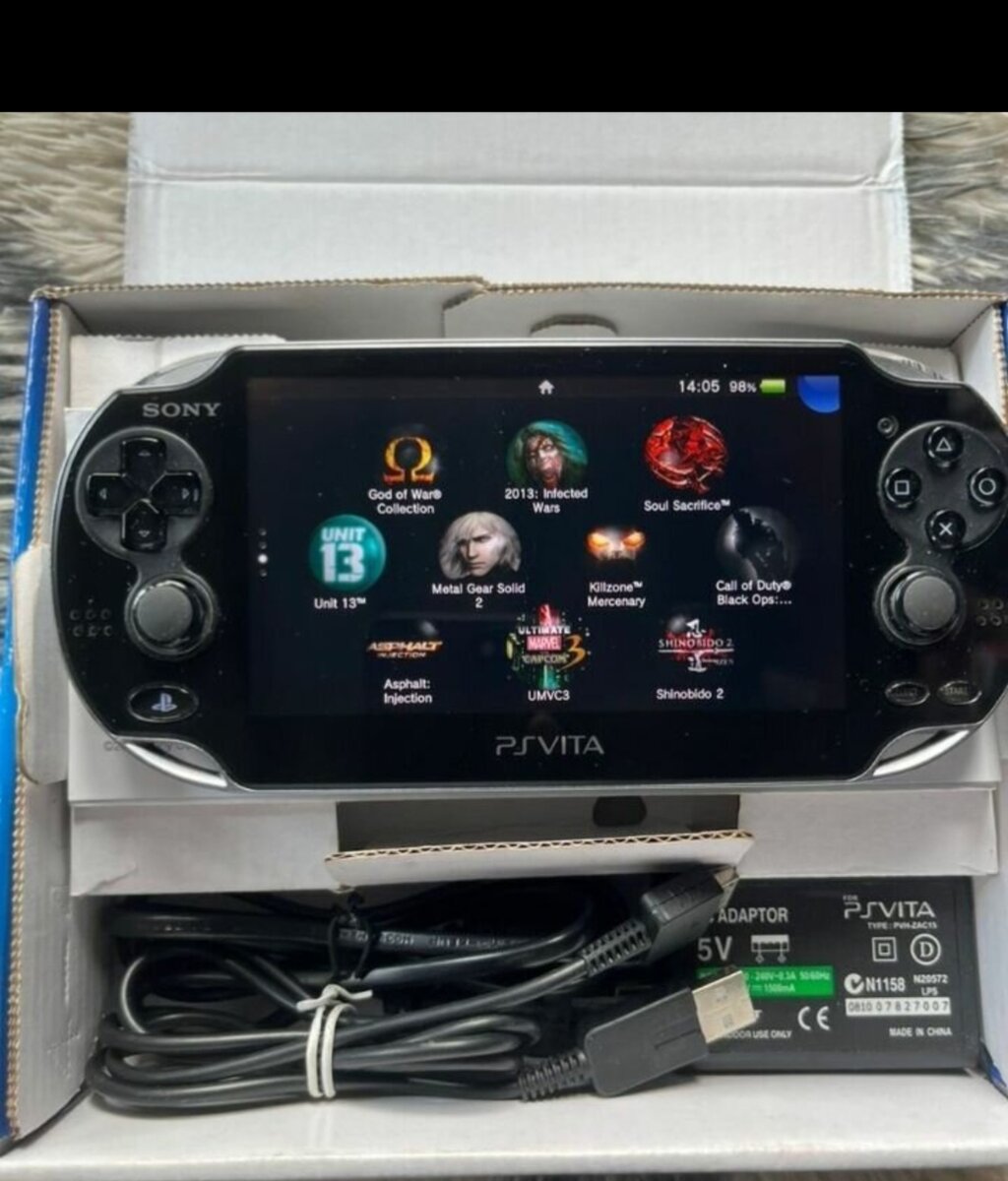 Console de jeu portable Sony PSVITA avec écran tactile, double joystick et câble de charge inclus. Idéale pour les jeux vidéo en déplacement.