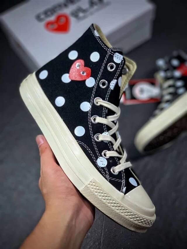 Découvrez les Converse Chuck Taylor Play Heart, baskets noires à pois blancs et cœur rouge. Conçues pour un style unique et tendance, ces chaussures sont parfaites pour faire une déclaration.