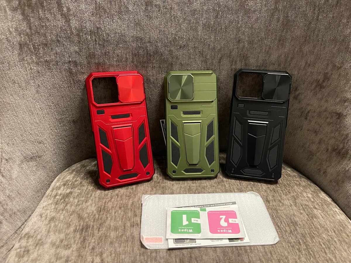 Coque antichoc Cambo Cyber Punk pour iPhone 12/13/14 Pro Max. Support pliable, cache caméra, protection extrême. Rouge / Vert / Noir.