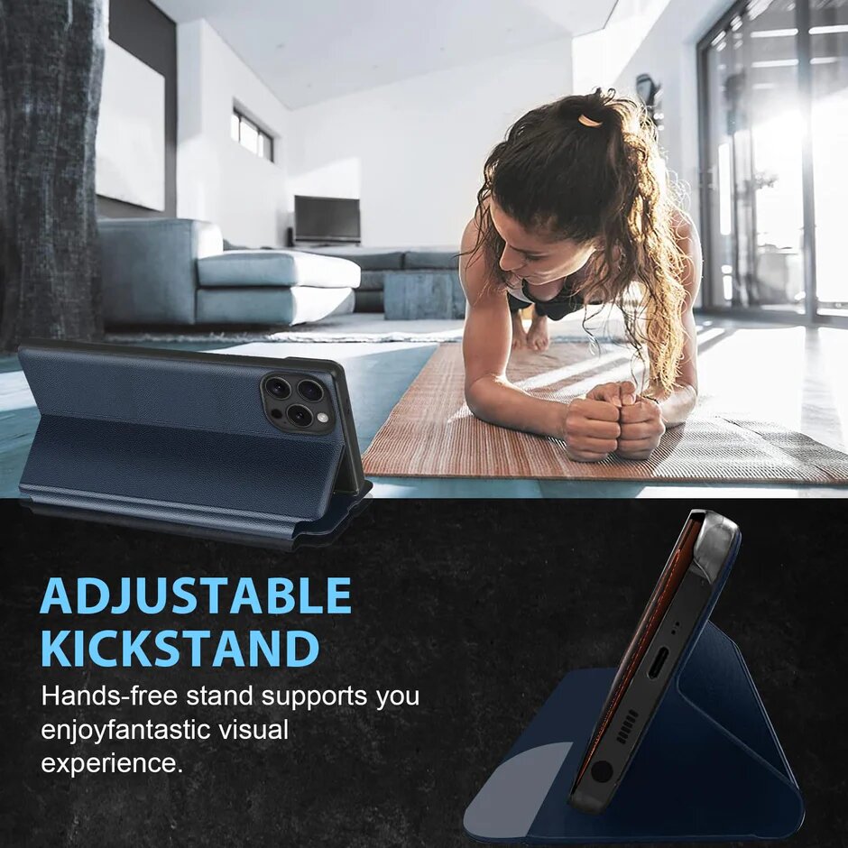 Coque pour 16 Pro Max, en cuir transparent avec fenêtre de visualisation, à rabat rigide, 360 degrés antichoc, résistant aux rayures, fonction support, étui de protection