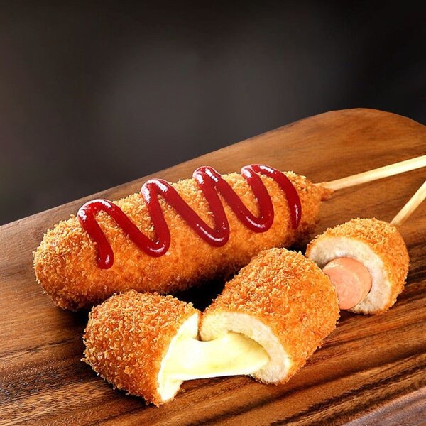 Savourez ces corn dogs croustillants à l'extérieur et tendres à l'intérieur, garnis de ketchup et de mayonnaise pour un goût irrésistible. Parfait pour des repas rapides et délicieux entre amis ou en famille.