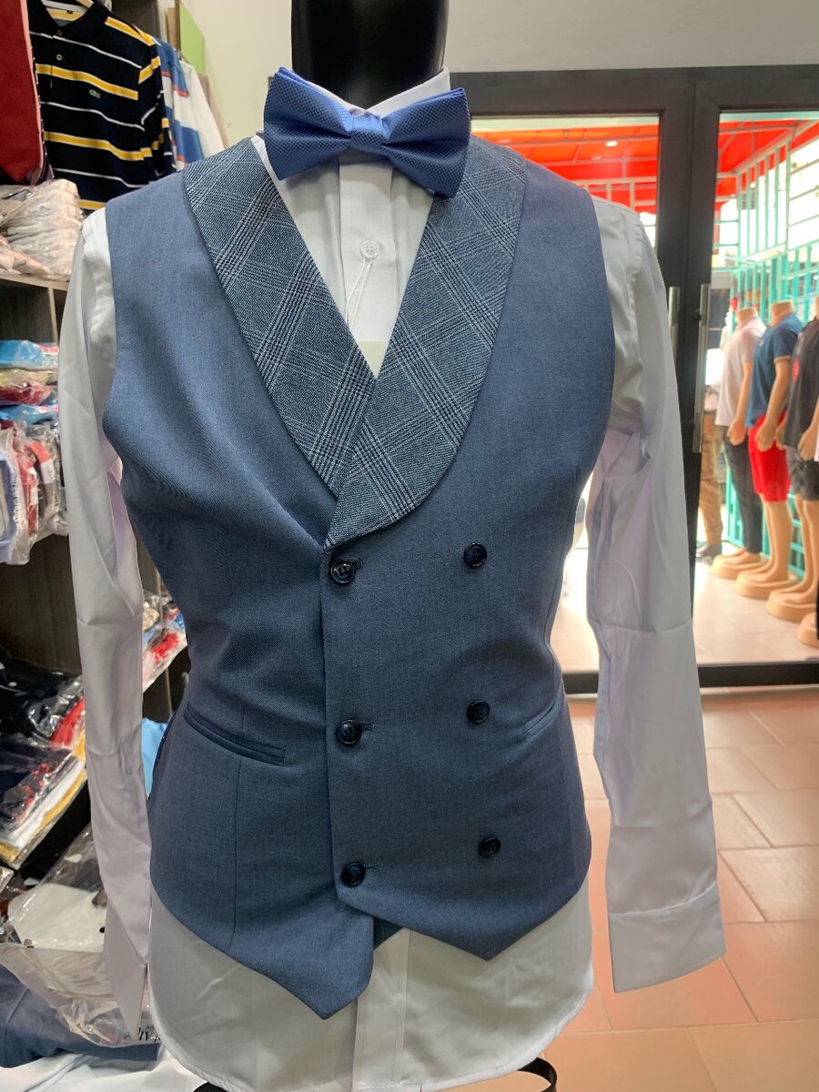 Optez pour ce costume bleu sophistiqué pour homme, parfait pour les occasions spéciales et professionnelles. Composé d'une veste à motifs subtils, d'un gilet assorti et d'une chemise avec cravate, il ajoute une touche d'élégance raffinée à votre garde-robe.