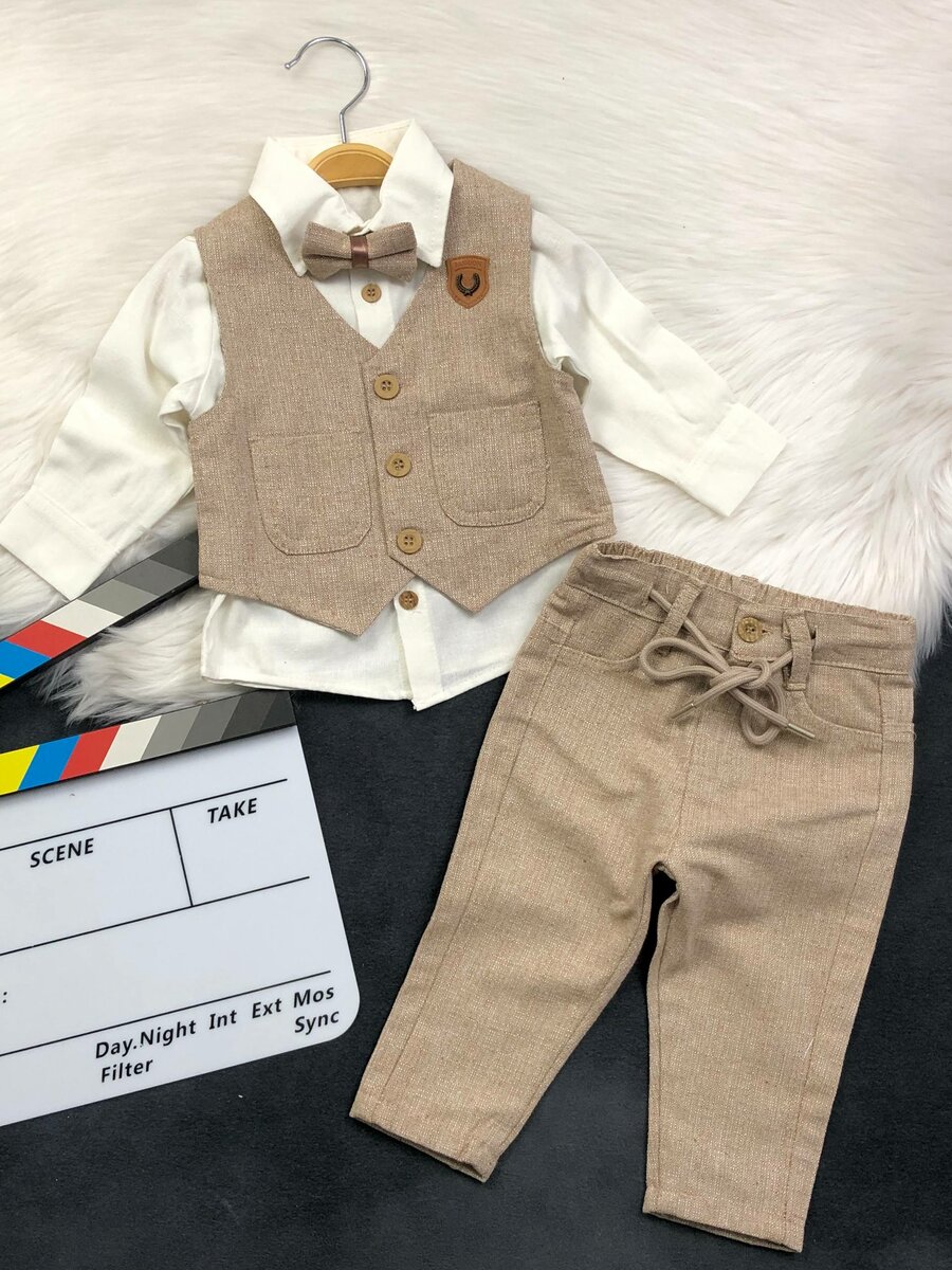 Ensemble élégant pour garçons, parfait pour les occasions spéciales. Comprend une chemise blanche, un gilet et un pantalon assortis avec un nœud papillon. Confortable et stylé, idéal pour les cérémonies.