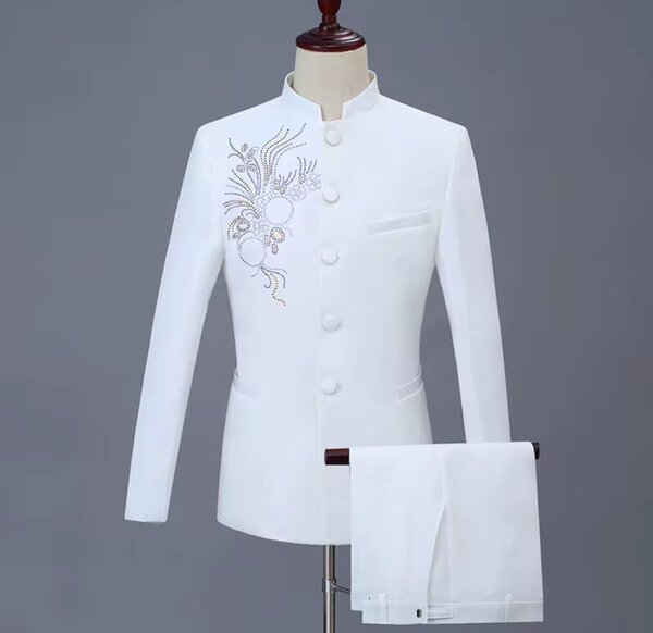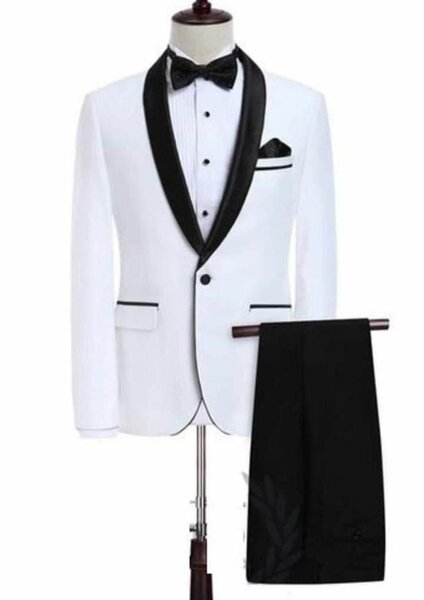 Ce costume de mariage blanc avec détails noirs est idéal pour une cérémonie élégante. Conçu pour un look sophistiqué, il dispose d'une veste ajustée et d'un nœud papillon assorti. Parfait pour le marié ou des occasions spéciales.