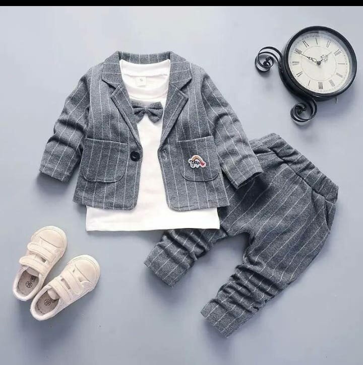 Adorable ensemble pour enfants avec veste à rayures, pantalon assorti, t-shirt blanc et mocassins. Parfait pour les occasions spéciales et look élégant.