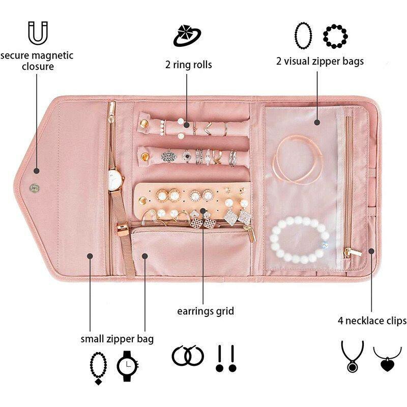 This a jewelry organizer portable for traveling and keeping all your jewelry organized. From rings, bracelets, necklaces, Anklet, watches. Can be washed.