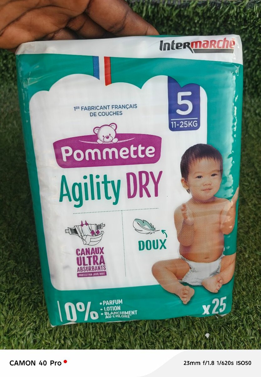 Couches Pommette Agility Dry pour bébé de 11 à 25 kg. Design ultra-absorbant pour un confort durable sans parfum. Parfaites pour garder votre bébé au sec toute la journée. Lot de 25 couches.