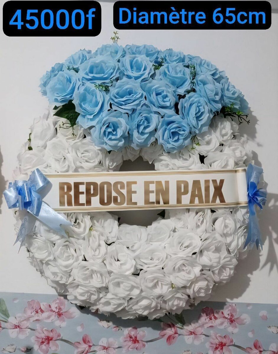 Hommage élégant avec cette couronne funéraire de roses bleues et blanches. Son design apaisant exprime vos condoléances avec respect et beauté. Parfaite pour rendre un dernier hommage.