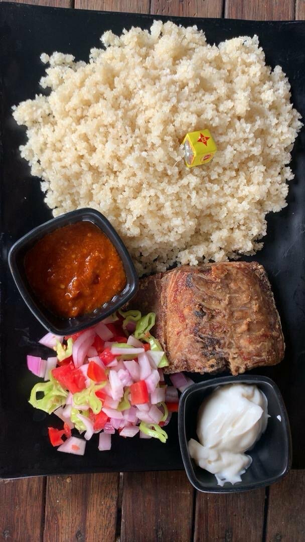 Dégustez un délicieux plat de couscous accompagné de poisson frit croustillant, frais mélange de légumes et savoureuse sauce piquante! Parfait pour un repas équilibré et savoureux.