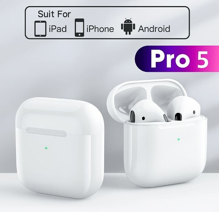 Découvrez les écouteurs sans fil Pro 5, compatibles avec iPad, iPhone et Android. Idéal pour écouter de la musique ou passer des appels. Design élégant et confortable pour un usage quotidien.