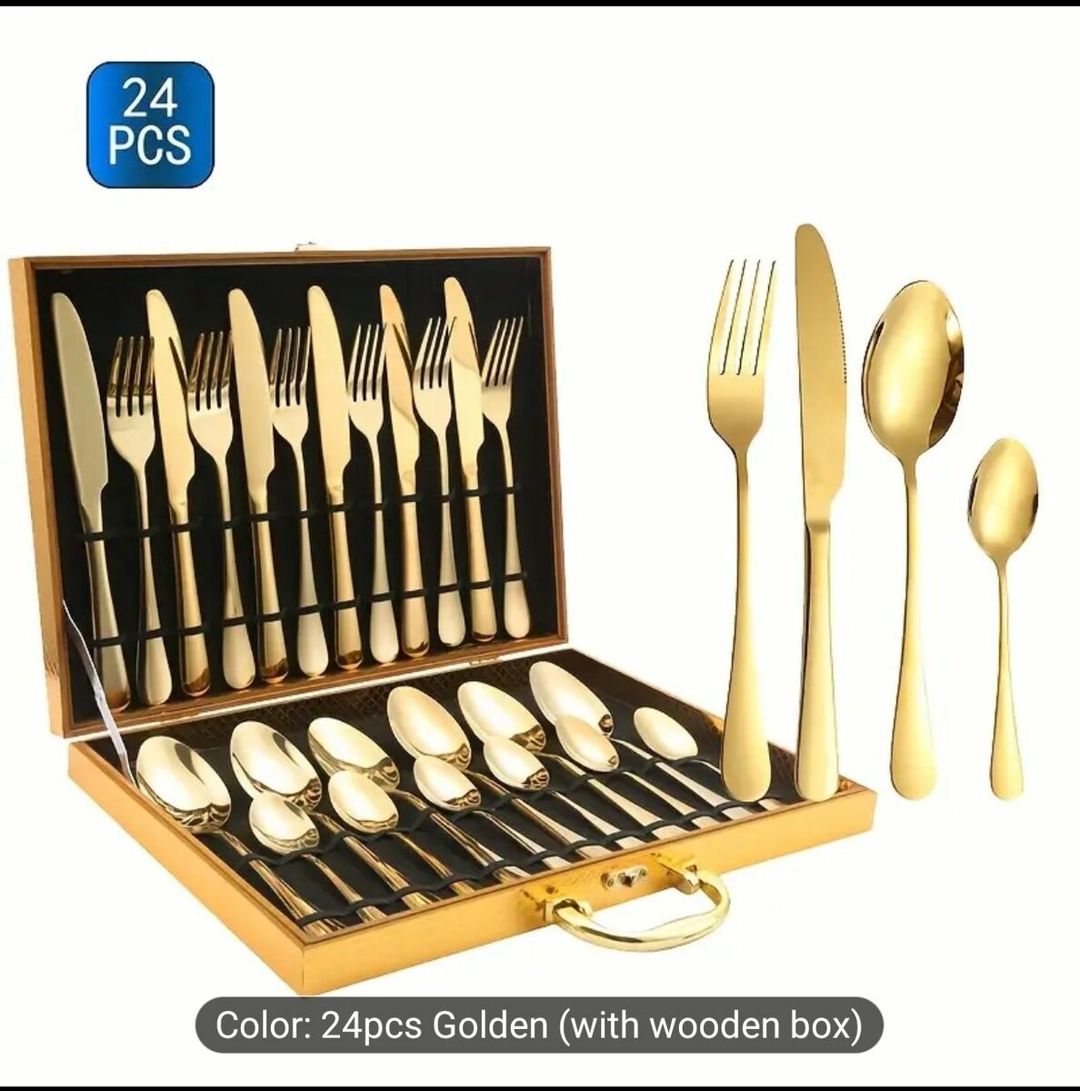 Ensemble de couverts dorés 24 pièces, idéal pour des dîners élégants. Inclut couteaux, fourchettes, cuillères et petites cuillères. Présenté dans un coffret en bois raffiné. Parfait pour surprendre vos invités et embellir votre table. Un choix élégant pour toute occasion spéciale.