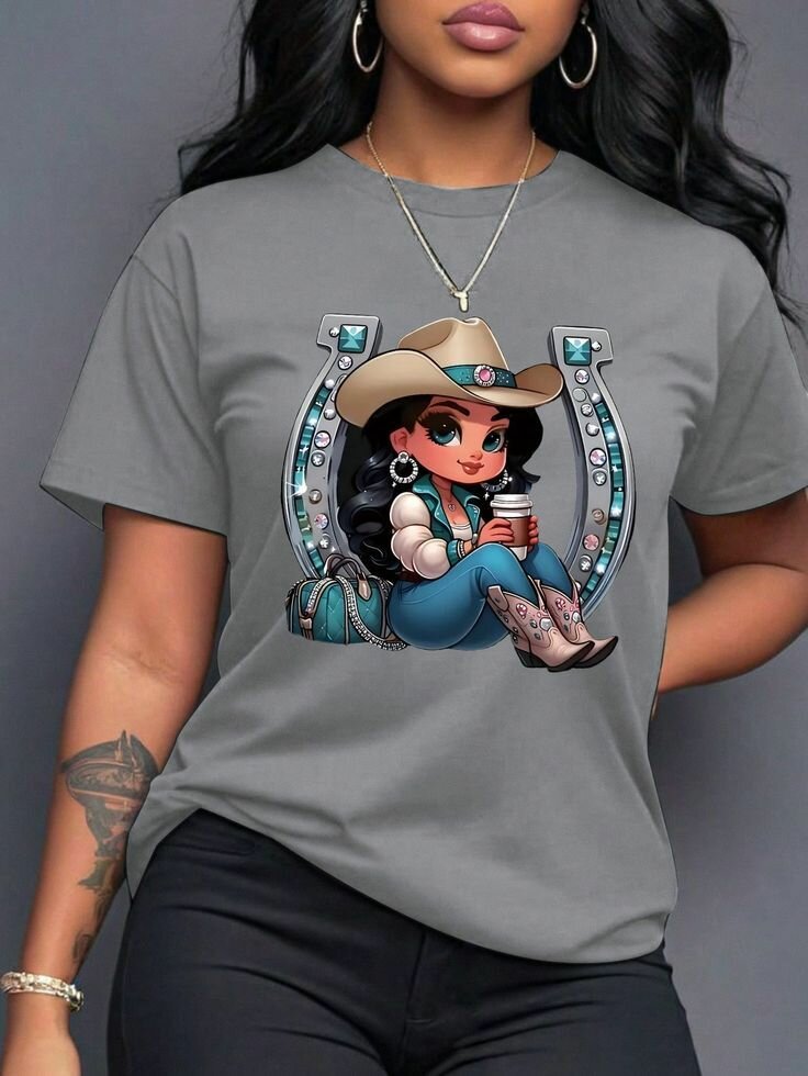 Embrace a wild west vibe with this stylish cowgirl graphic tee. Perfect for casual outings or adding a playful touch to your wardrobe. Made from soft, comfortable fabric, it promises to keep you cool and chic. Ideal for rodeo fans or fashion lovers. Stand out with this unique design!