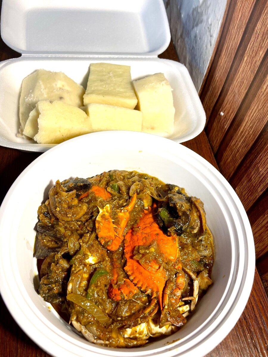 Savourez notre spécialité exotique : crabe épicé accompagné de tendres ignames. Parfait pour un repas exotique à domicile. Idéal pour les amateurs de fruits de mer et de plats authentiques.