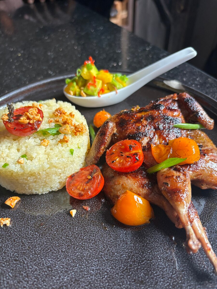 Savourez une délicieuse caille grillée, accompagnée de quinoa parfumé et garnie de tomates cerises éclatantes. Parfait pour un dîner gourmand et raffiné à la maison.