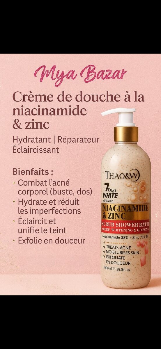 Cette crème de douche enrichie en niacinamide et zinc éclaircit, hydrate et combat l'acné. Idéale pour une peau éclatante et unifiée. Exfolie en douceur tout en réduisant les tâches noires et restaure la peau endommagée