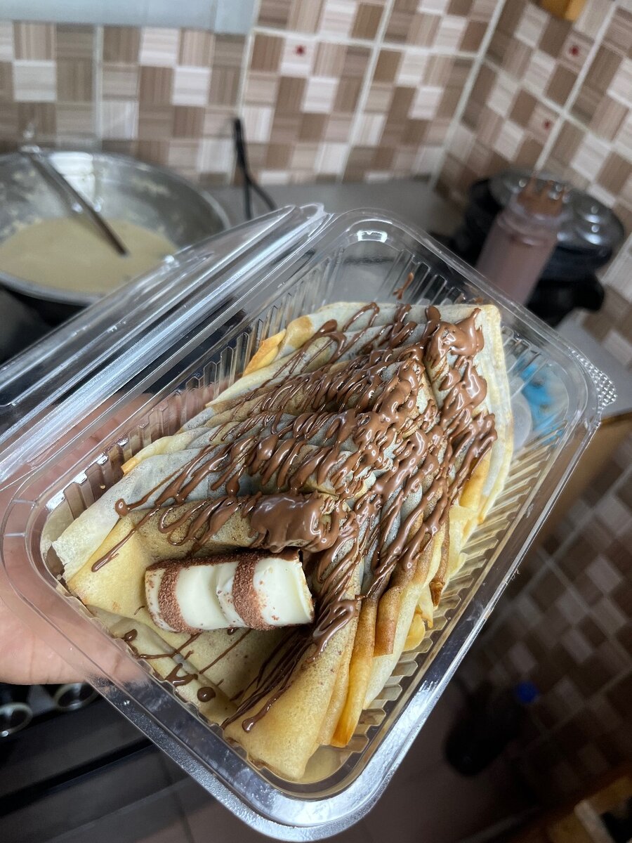 Savourez cette crêpe gourmande, généreusement garnie de Nutella et de morceaux de Kinder. Idéale pour une pause sucrée ou pour un dessert délicieux à partager. C'est le choix parfait pour les amateurs de chocolat qui cherchent une douceur fondante et incontournable. Profitez de ce mélange onctueux et régressif qui séduira petits et grands.