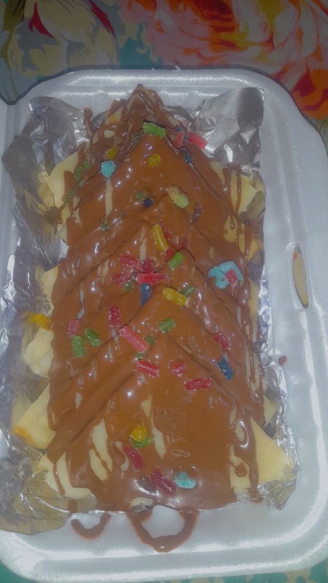 Savourez nos crêpes moelleuses, généreusement nappées de chocolat fondant, garnies de bonbons colorés pour une touche amusante. Parfaites pour toute occasion – plaisir garanti pour petits et grands.