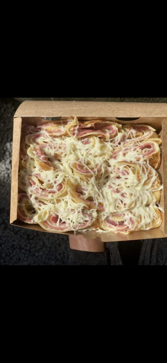Découvrez notre délicieux plateau de pâtes enroulées au jambon et nappées de fromage fondant.