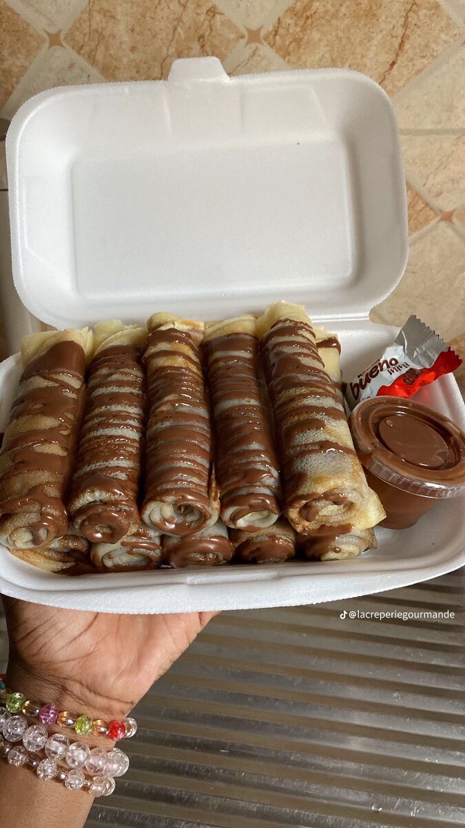 Découvrez nos délicieuses crêpes fourrées au chocolat, parfaites pour une pause gourmande. Chaque crêpe est soigneusement enroulée pour un maximum de plaisir et est accompagnée d'une sauce chocolatée onctueuse. Idéales pour les petits-déjeuners, les desserts ou les goûters.