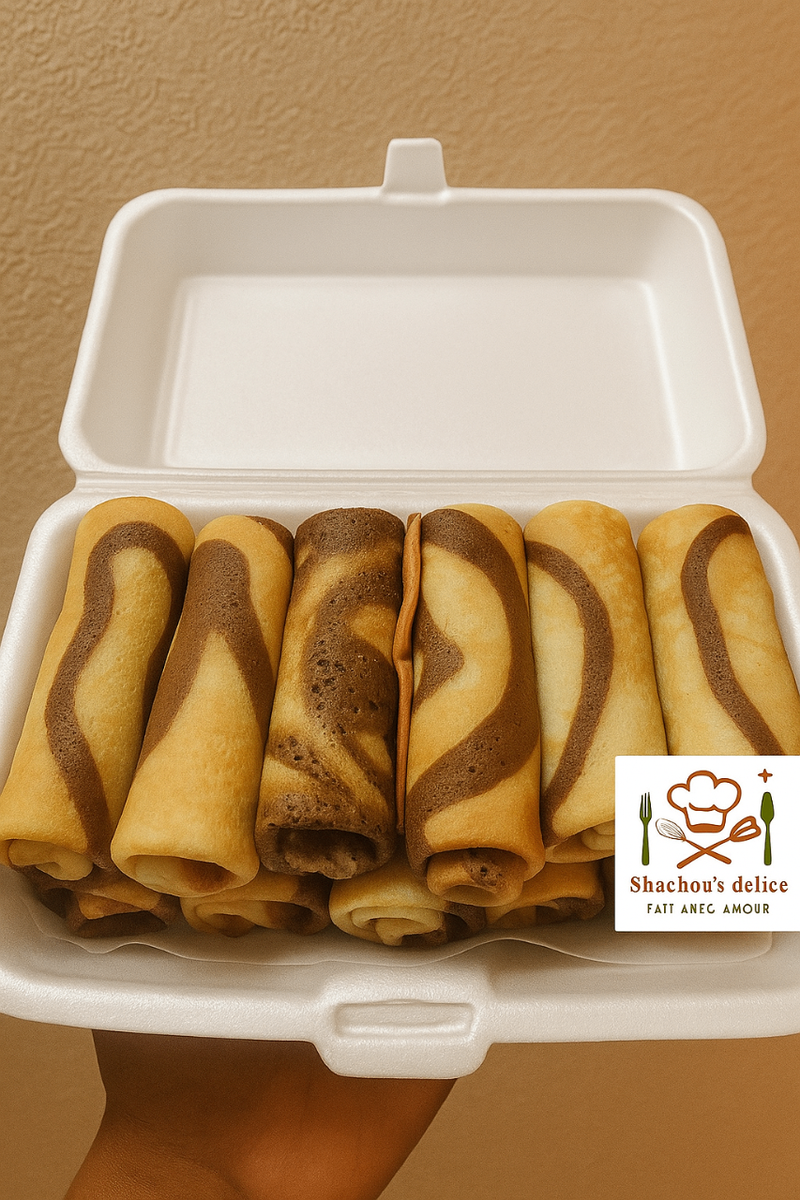 Savourez nos délicieuses crêpes moelleuses, 12 crêpes nature à 2500 , 12 crêpes tourbillons à 3000 et 10 crêpes fourrées au chocolat à 4000