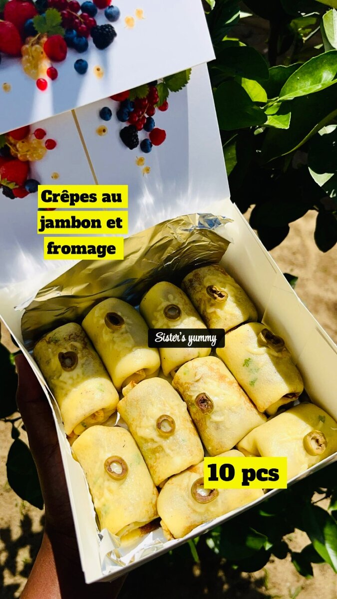 Dégustez nos délicieuses crêpes garnies de jambon et de fromage, parfaitement dorées. Idéales pour une collation rapide ou un apéritif. Chaque boîte contient 10 pièces savoureuses, prêtes à être partagées.