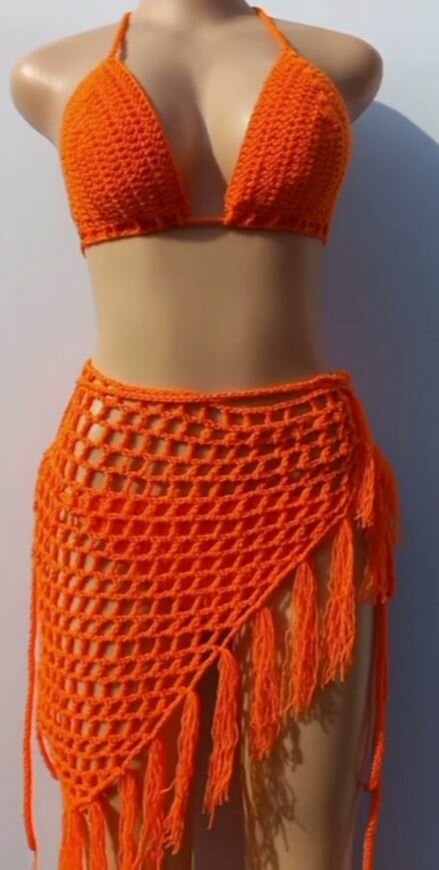 Stand out this summer with our vibrant crochet bikini set, featuring a stylish halter top and an eye-catching fringe skirt. Perfect for beach days and pool parties, this handmade set offers a unique, bohemian look. Made with high-quality yarn for comfort and durability. Ideal for those wanting to showcase their style.