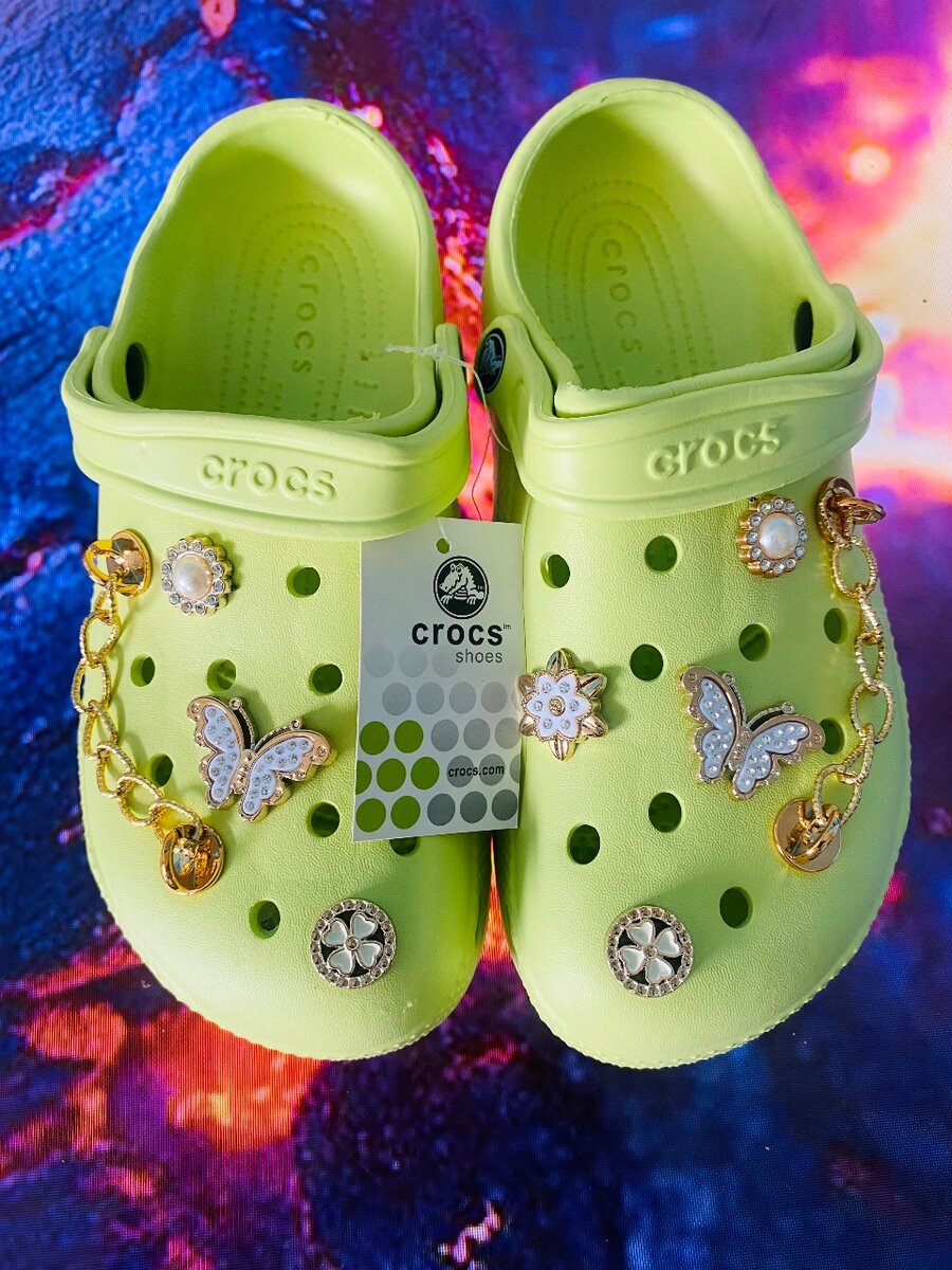 Stylish lime green Crocs clogs embellished with elegant charms and jewelry for a chic, comfortable fit. Perfect for casual outings or making a unique statement. These clogs offer the signature Crocs comfort while adding a touch of personality. Ideal for fashion-forward individuals looking for versatile footwear that transitions effortlessly from day to night.